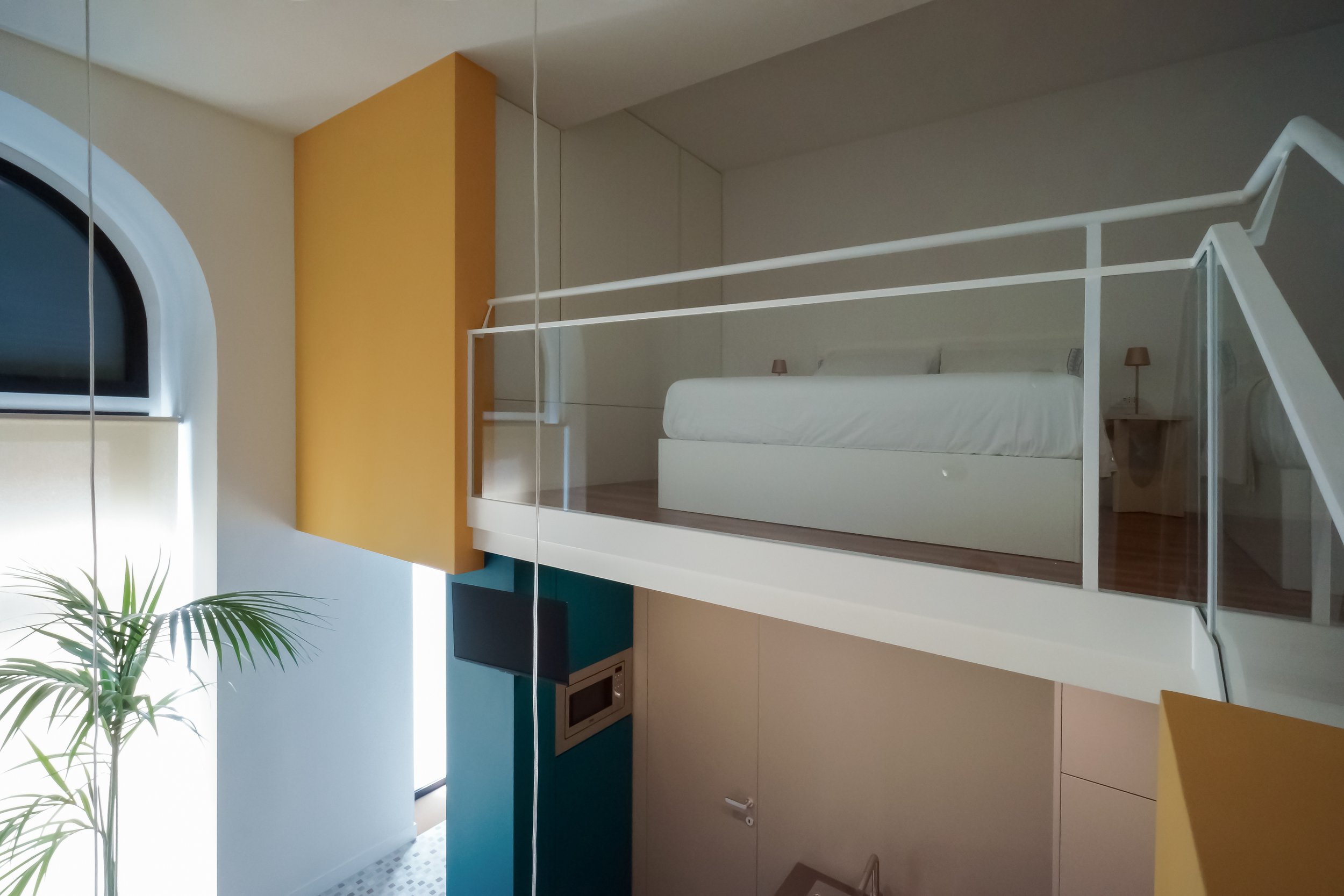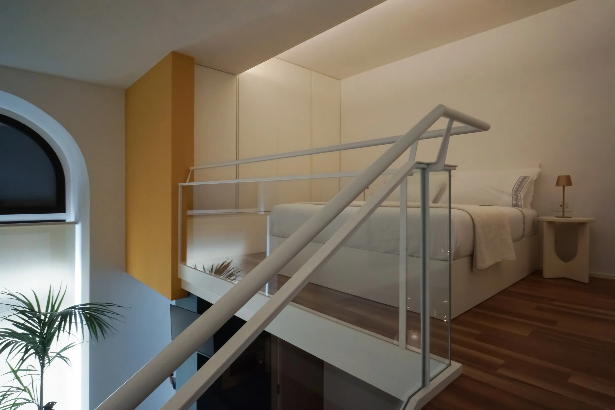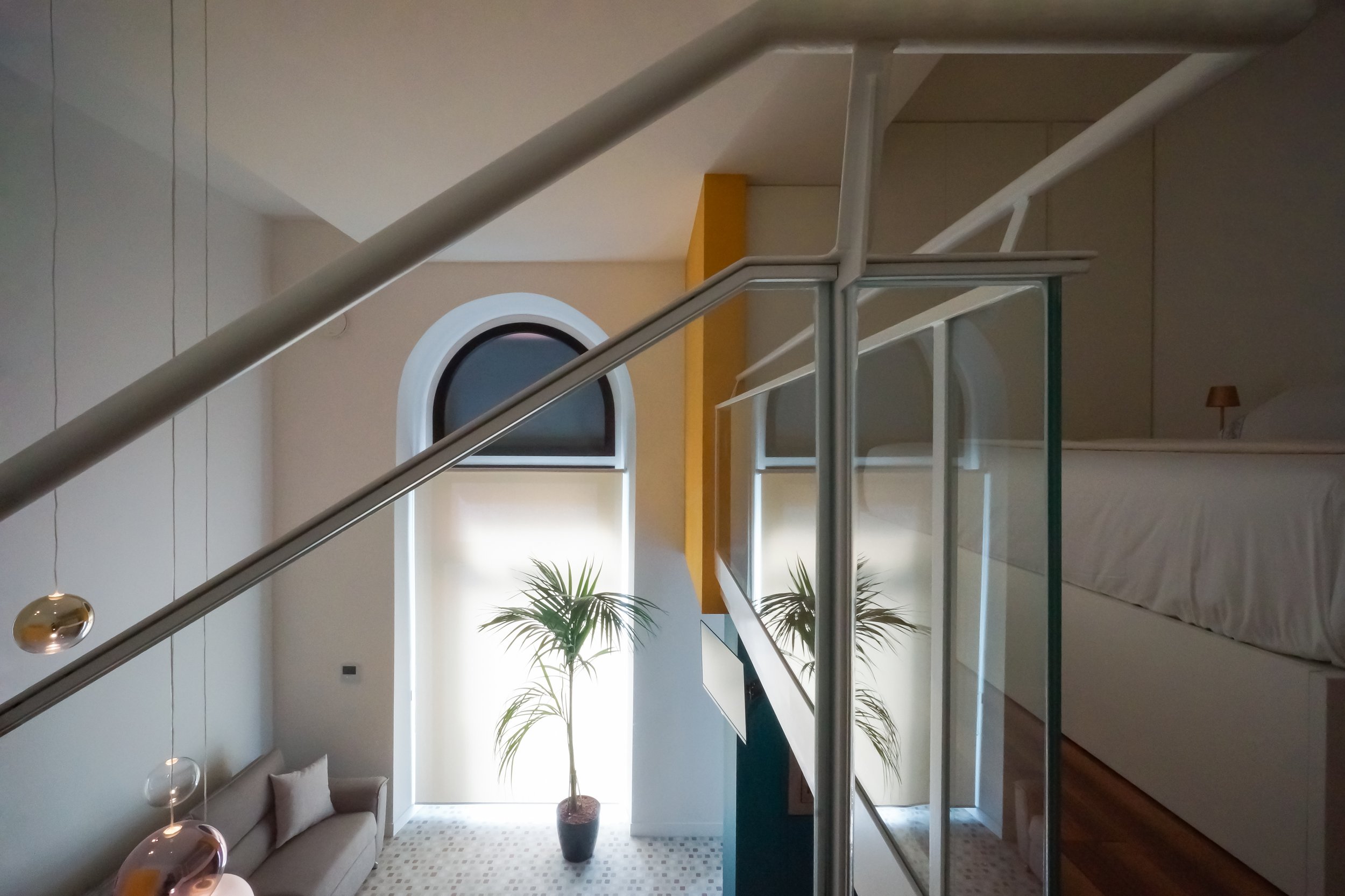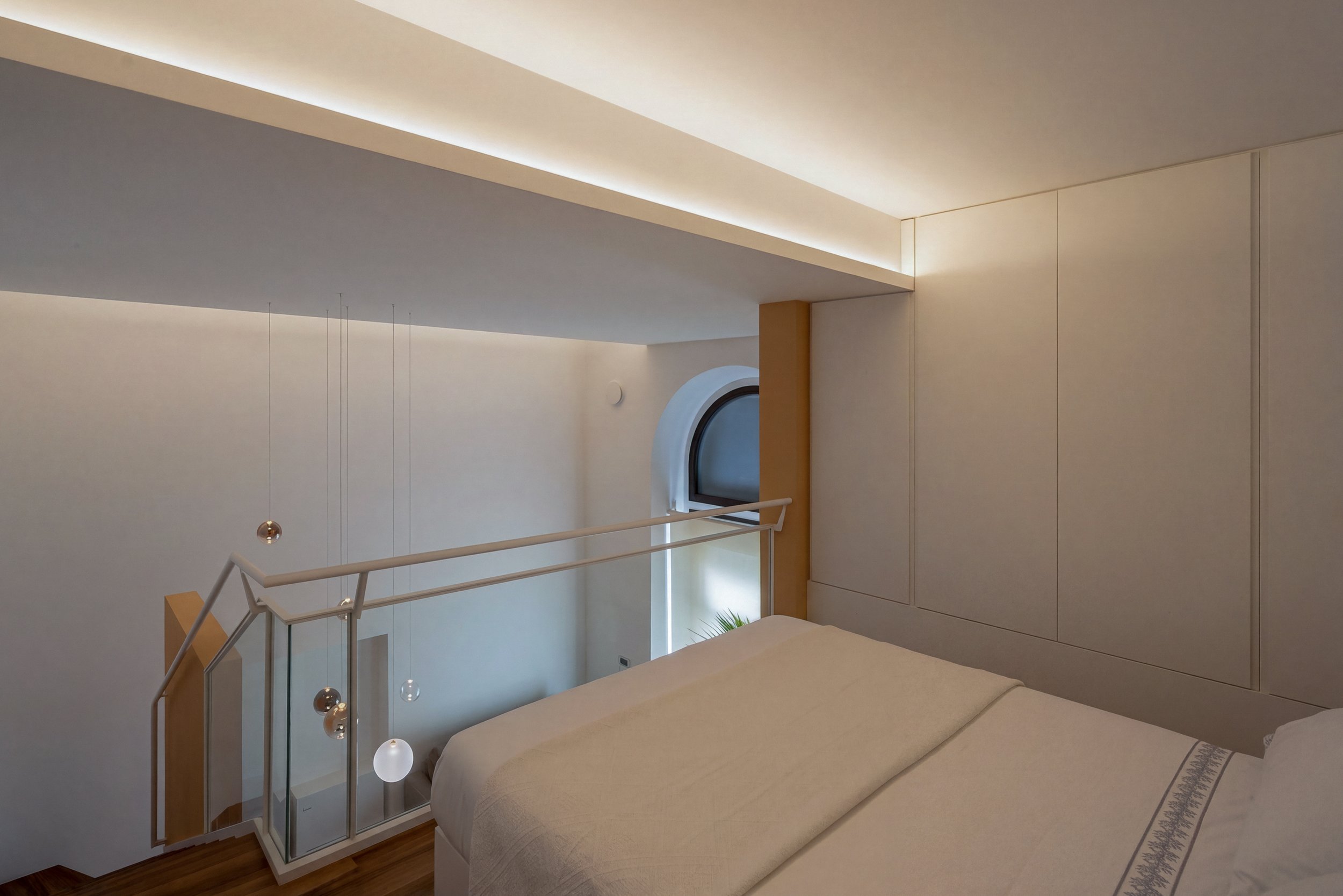Compositivamente il progetto tende a privilegiare la percezione unitaria di quello spazio cubico, facendo in modo che tutti gli elementi che lo articolano, anche funzionalmente, siano soltanto superfici piane isolate e cromaticamente distinte, pannelli che levitano nello spazio dato senza interrompere la sua costruzione geometrica. È così anche per l’orizzontamento del soppalco, con il quale si risolve la collocazione appartata della zona notte ma confermando la percezione complessiva della doppia altezza e il rapporto con il grande arco vetrato.