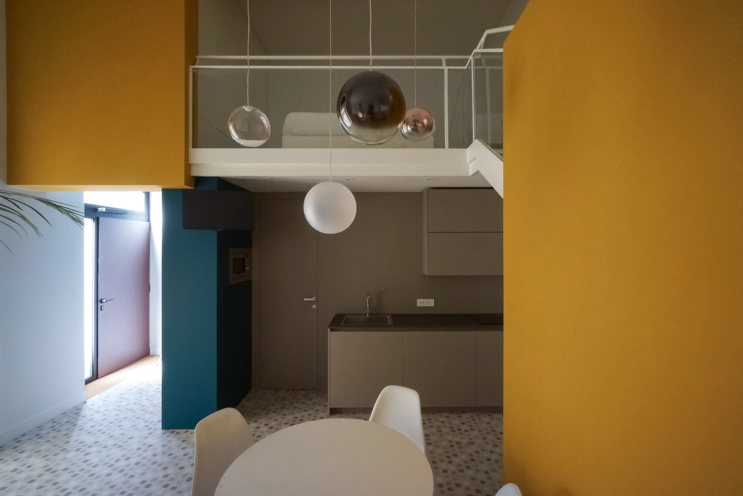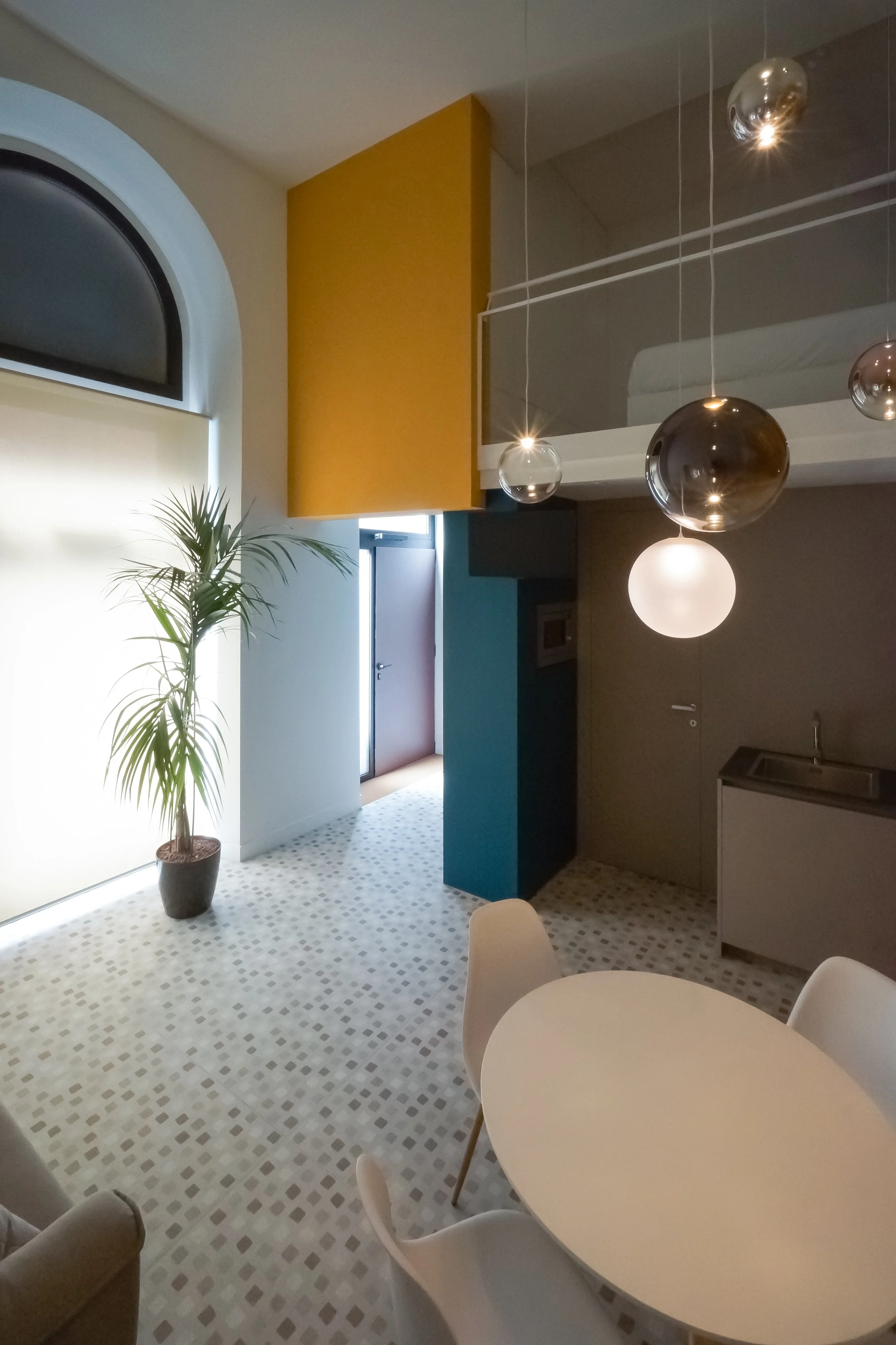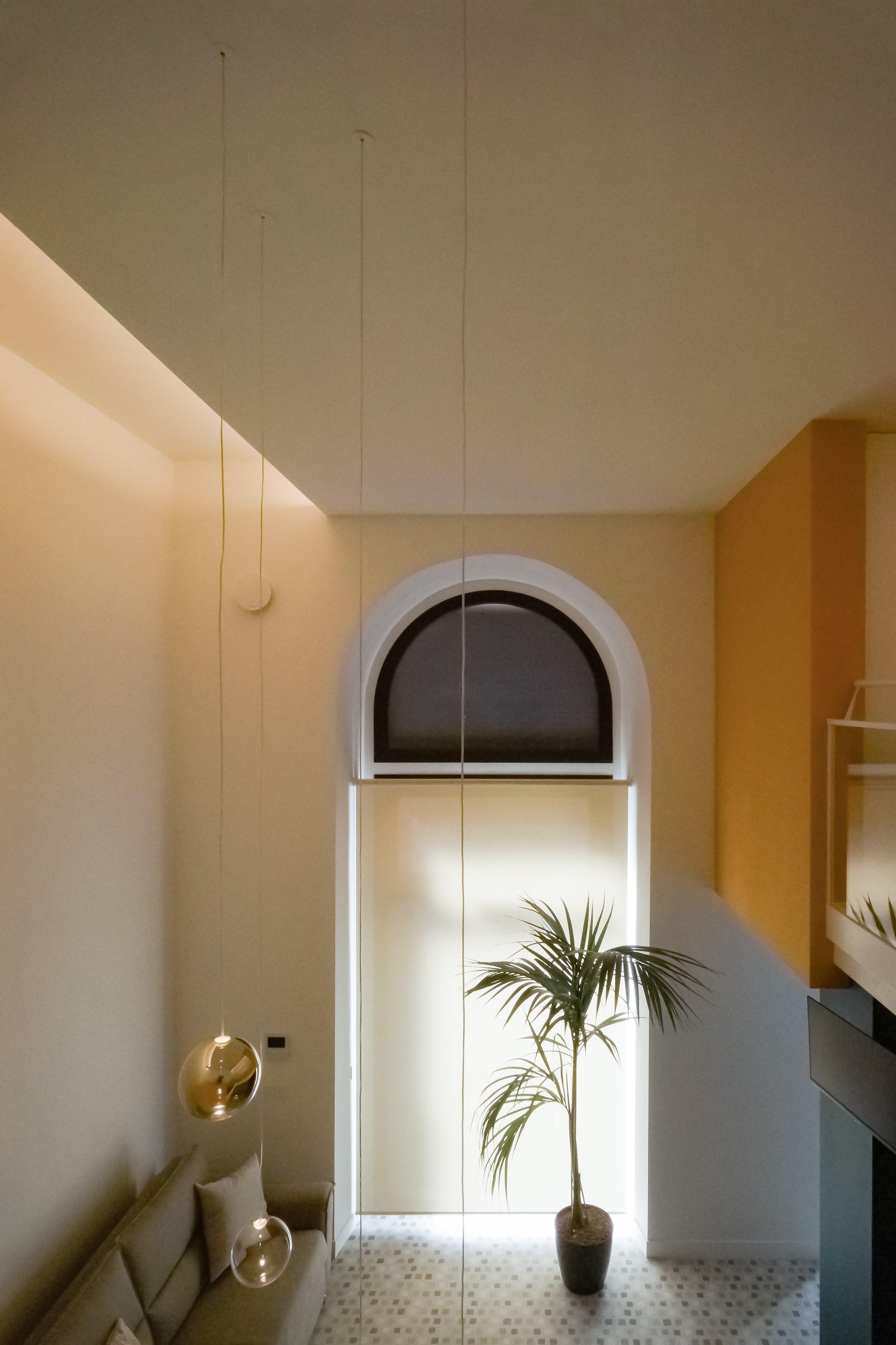Compositivamente il progetto tende a privilegiare la percezione unitaria di quello spazio cubico, facendo in modo che tutti gli elementi che lo articolano, anche funzionalmente, siano soltanto superfici piane isolate e cromaticamente distinte, pannelli che levitano nello spazio dato senza interrompere la sua costruzione geometrica. È così anche per l’orizzontamento del soppalco, con il quale si risolve la collocazione appartata della zona notte ma confermando la percezione complessiva della doppia altezza e il rapporto con il grande arco vetrato.