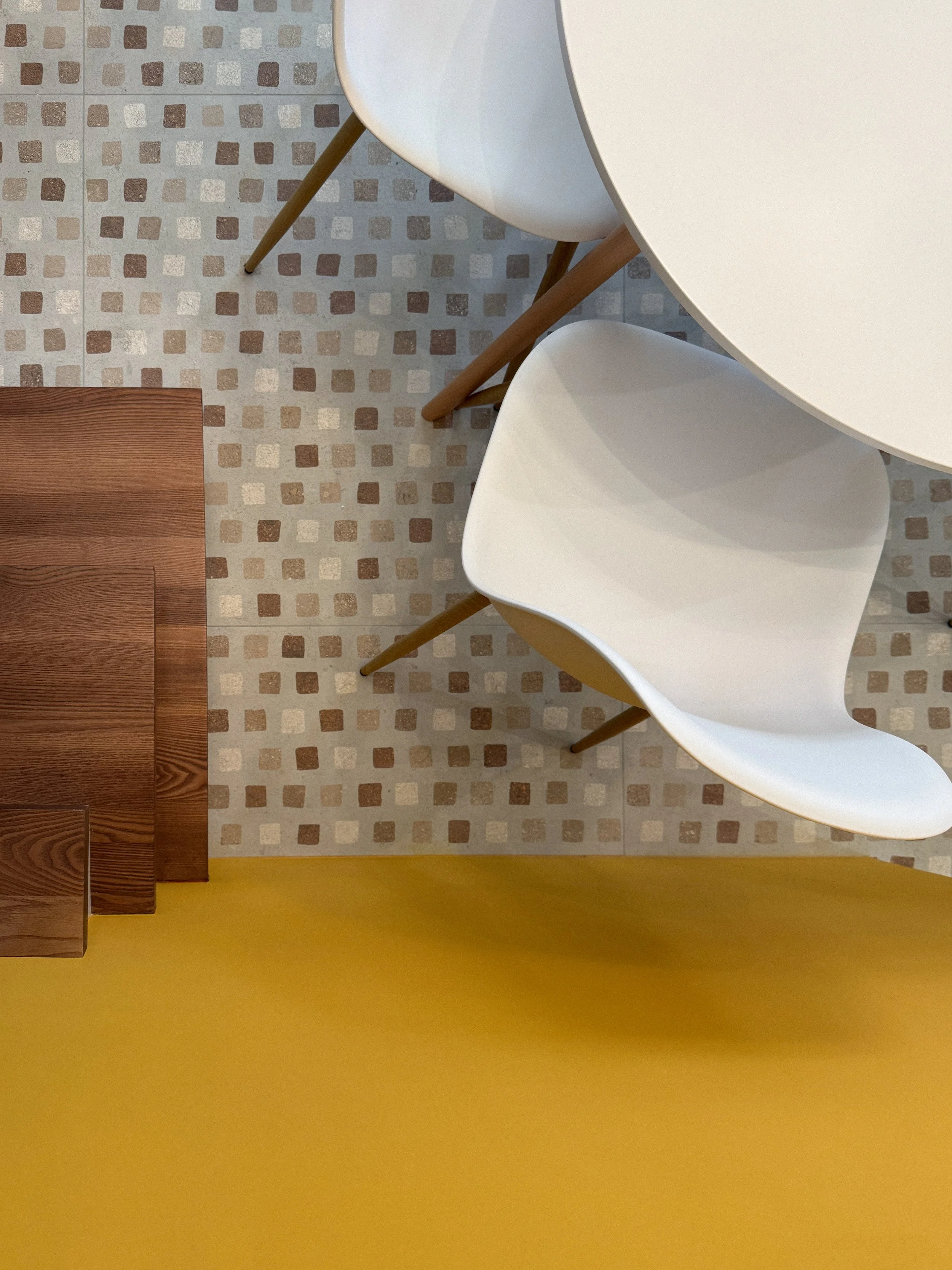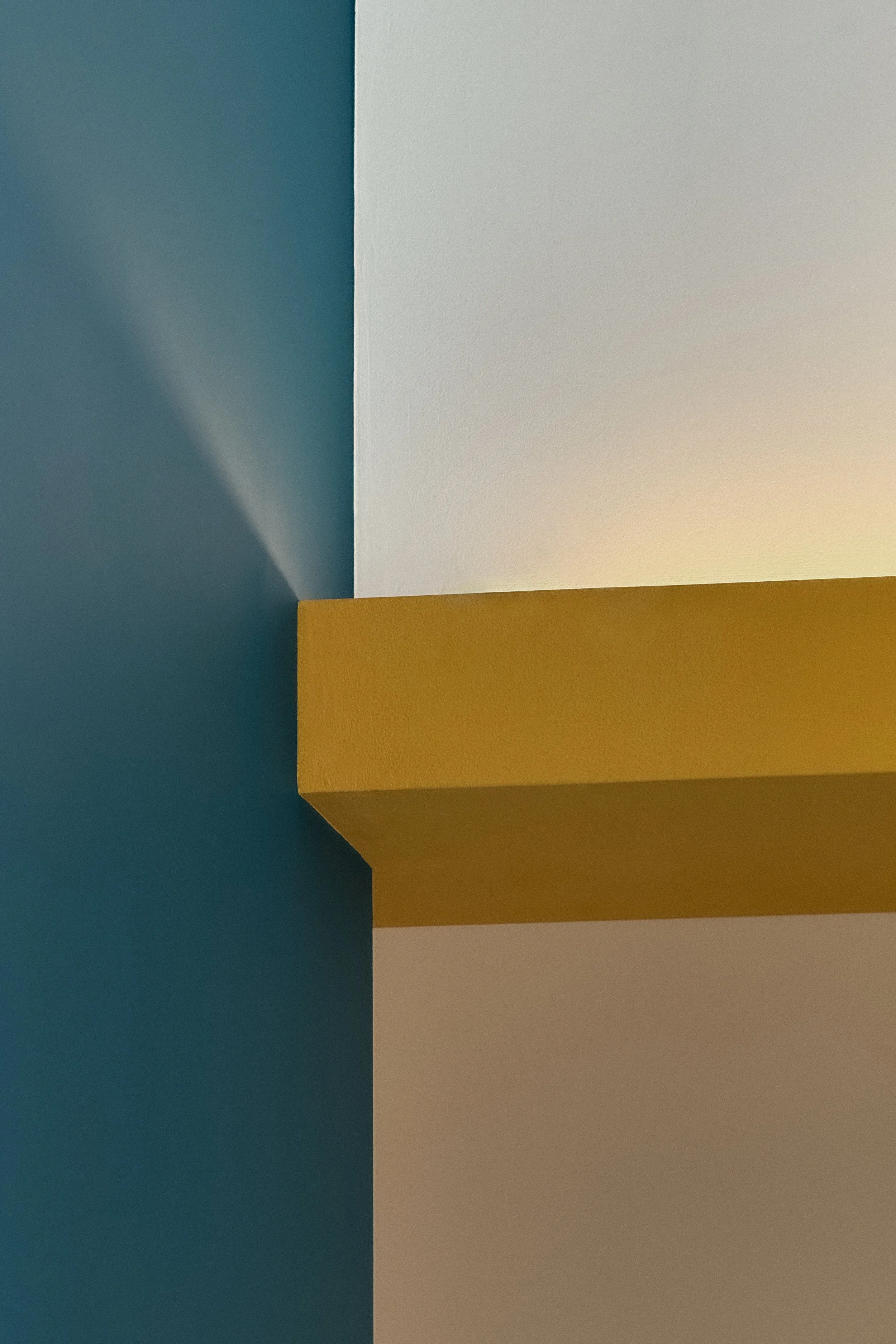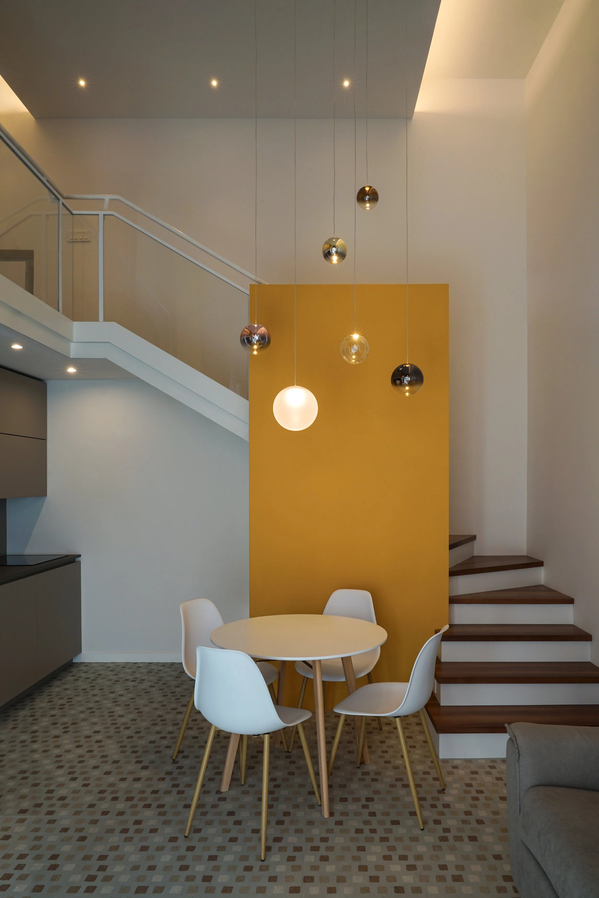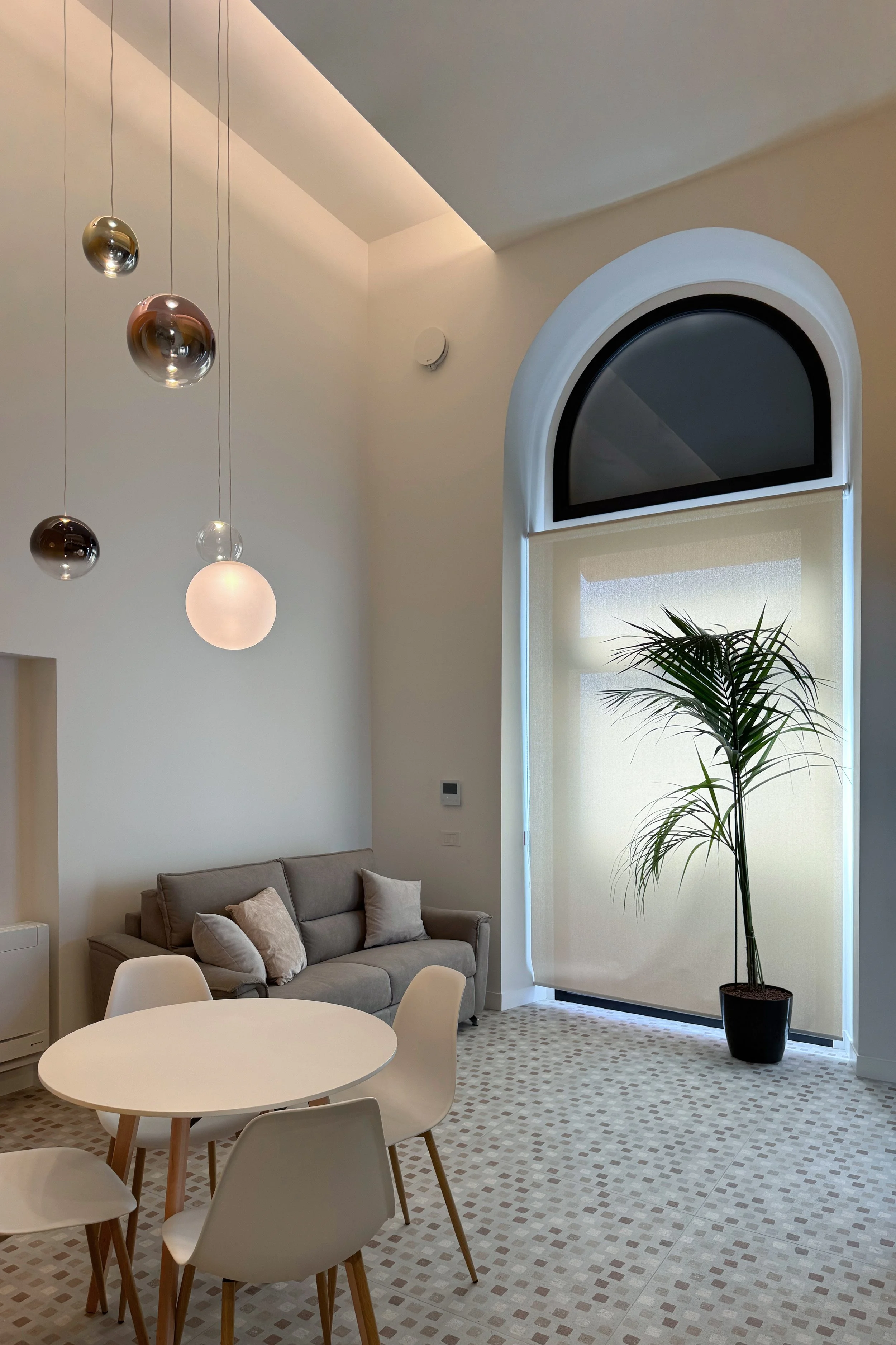 Compositivamente il progetto tende a privilegiare la percezione unitaria di quello spazio cubico, facendo in modo che tutti gli elementi che lo articolano, anche funzionalmente, siano soltanto superfici piane isolate e cromaticamente distinte, pannelli che levitano nello spazio dato senza interrompere la sua costruzione geometrica. È così anche per l’orizzontamento del soppalco, con il quale si risolve la collocazione appartata della zona notte ma confermando la percezione complessiva della doppia altezza e il rapporto con il grande arco vetrato.