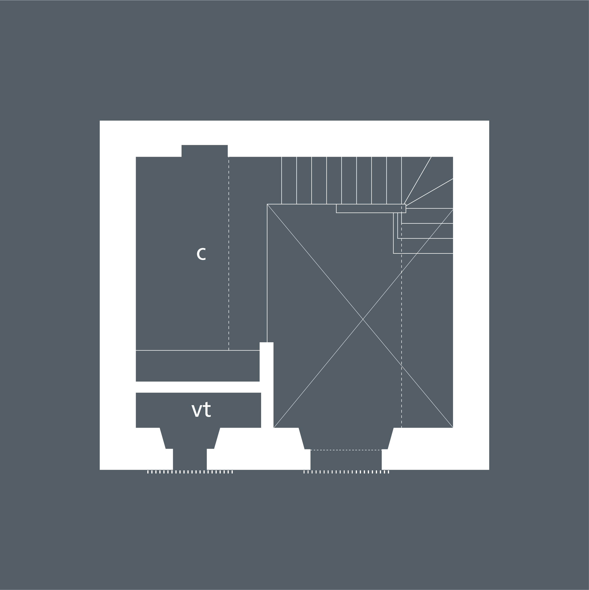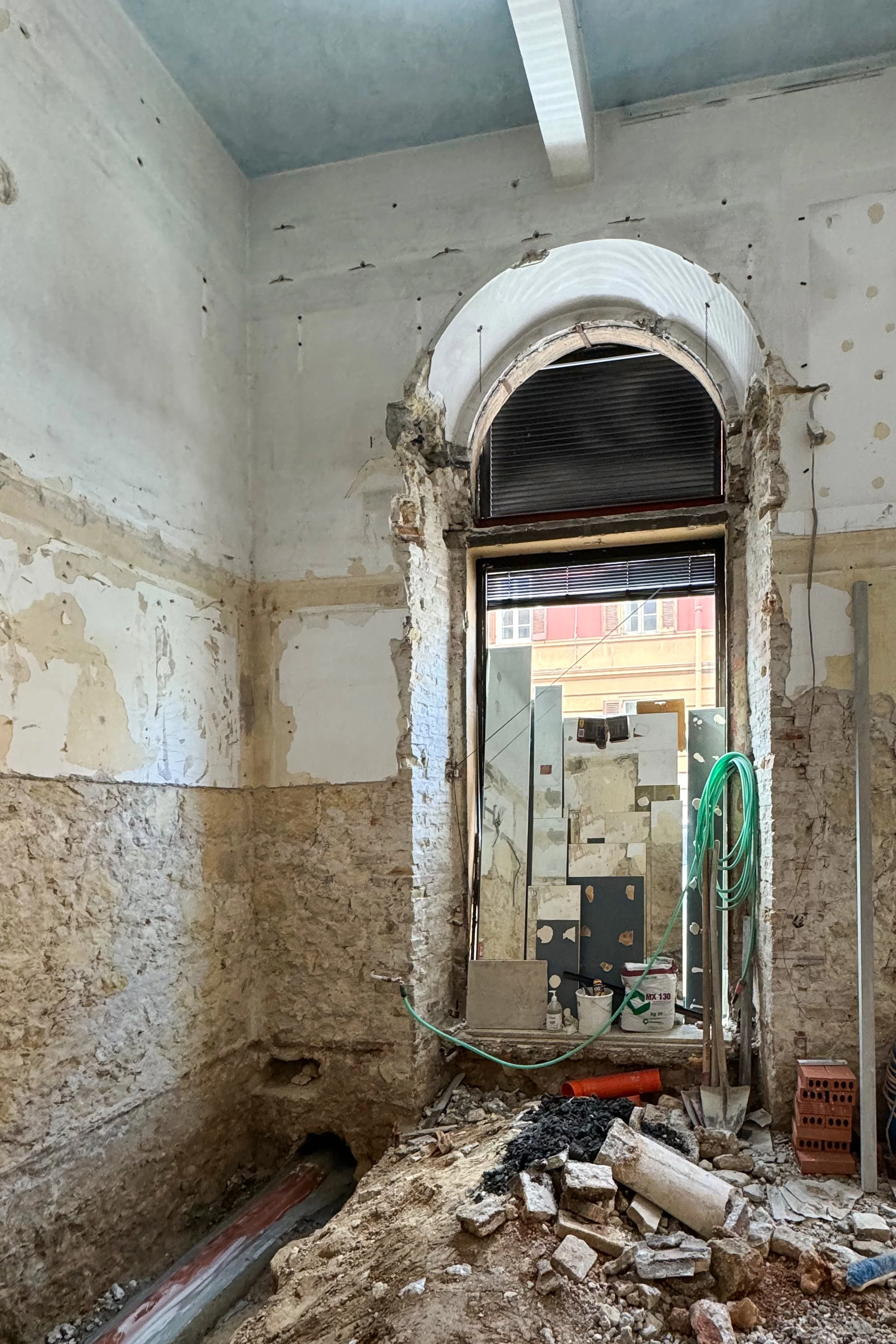 È uno spazio astratto, netto, geometrico. Concluso, verrebbe da dire, ma con due potenzialità evidenti, sebbene in cerca di soluzione: la grande altezza libera interna e, in rapporto con questa, l’ordine gigante delle aperture, ritagliate nella muratura di forte spessore.
