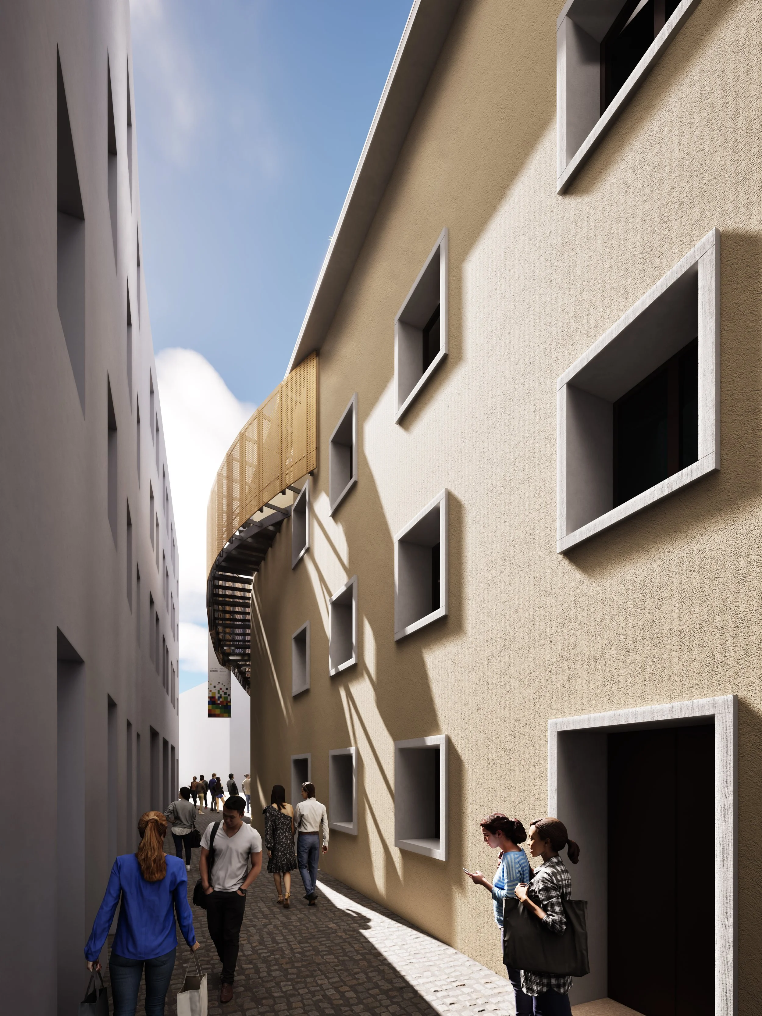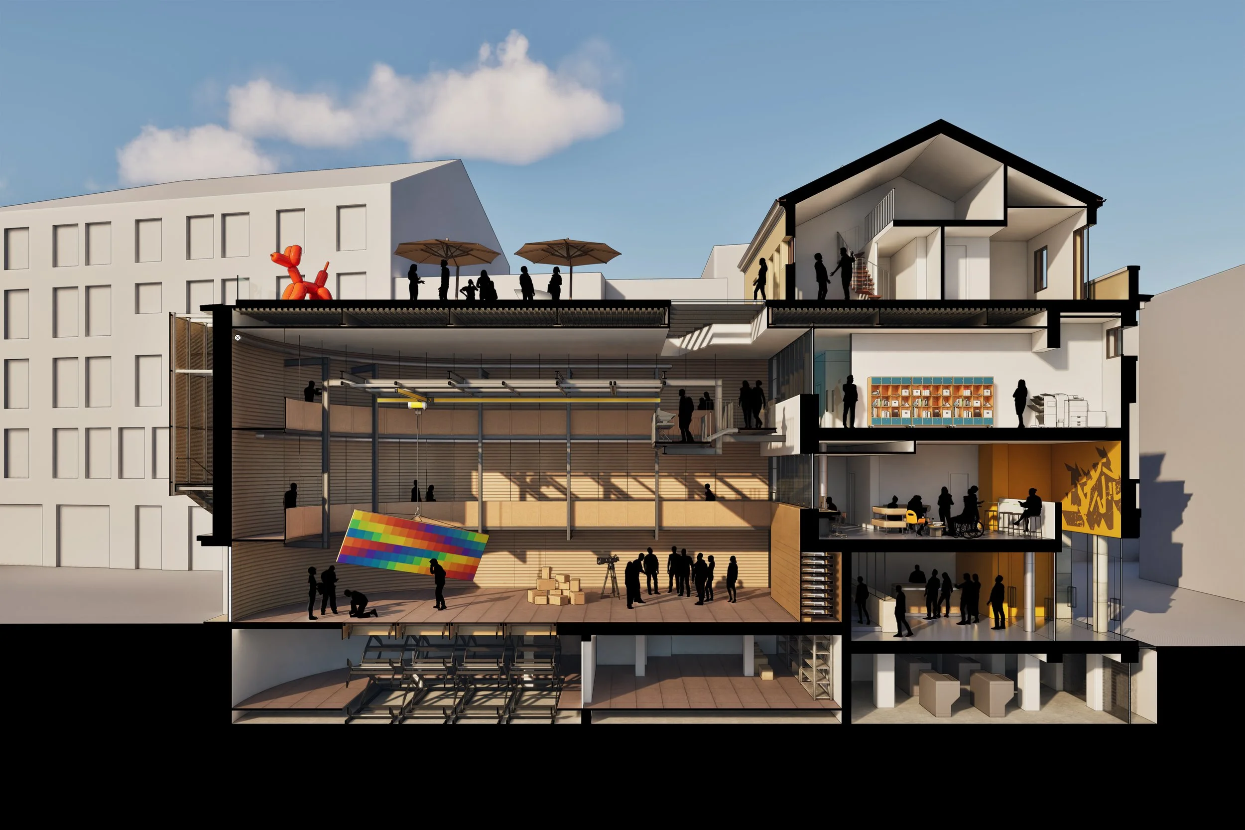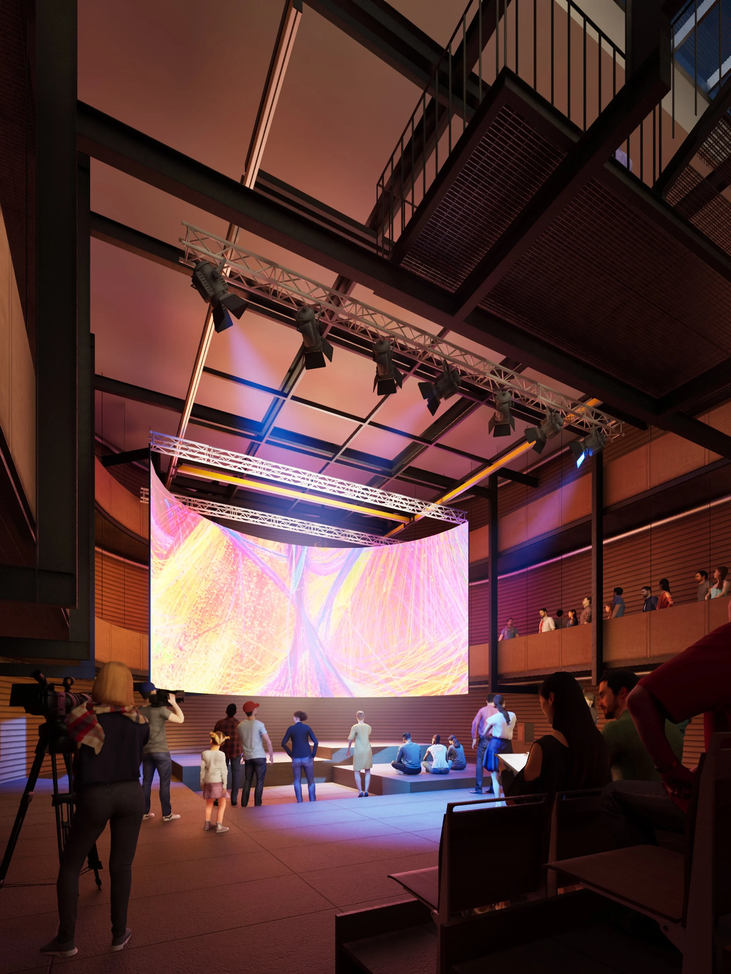 La mixité, intesa come integrazione di usi, linguaggi e funzioni, è il tema su cui si incardina il progetto. Nel nuovo Incubatore culturale di Arte Contemporanea il limite tra “quinte” e “dietro le quinte” rimane volutamente instabile, favorendo un ambiente fluido in cui attività, discipline e ruoli si intrecciano. La struttura funziona come una Factory contemporanea, in cui l’articolazione spaziale genera permeabilità e connessioni inattese.