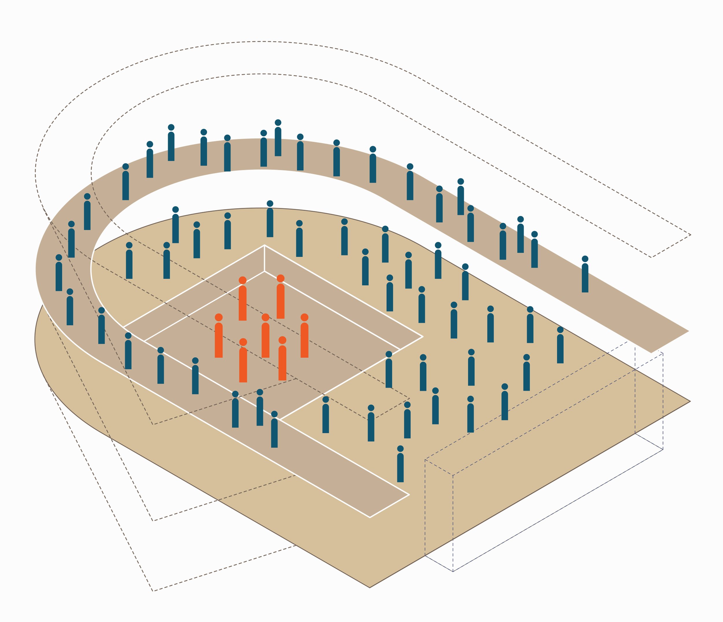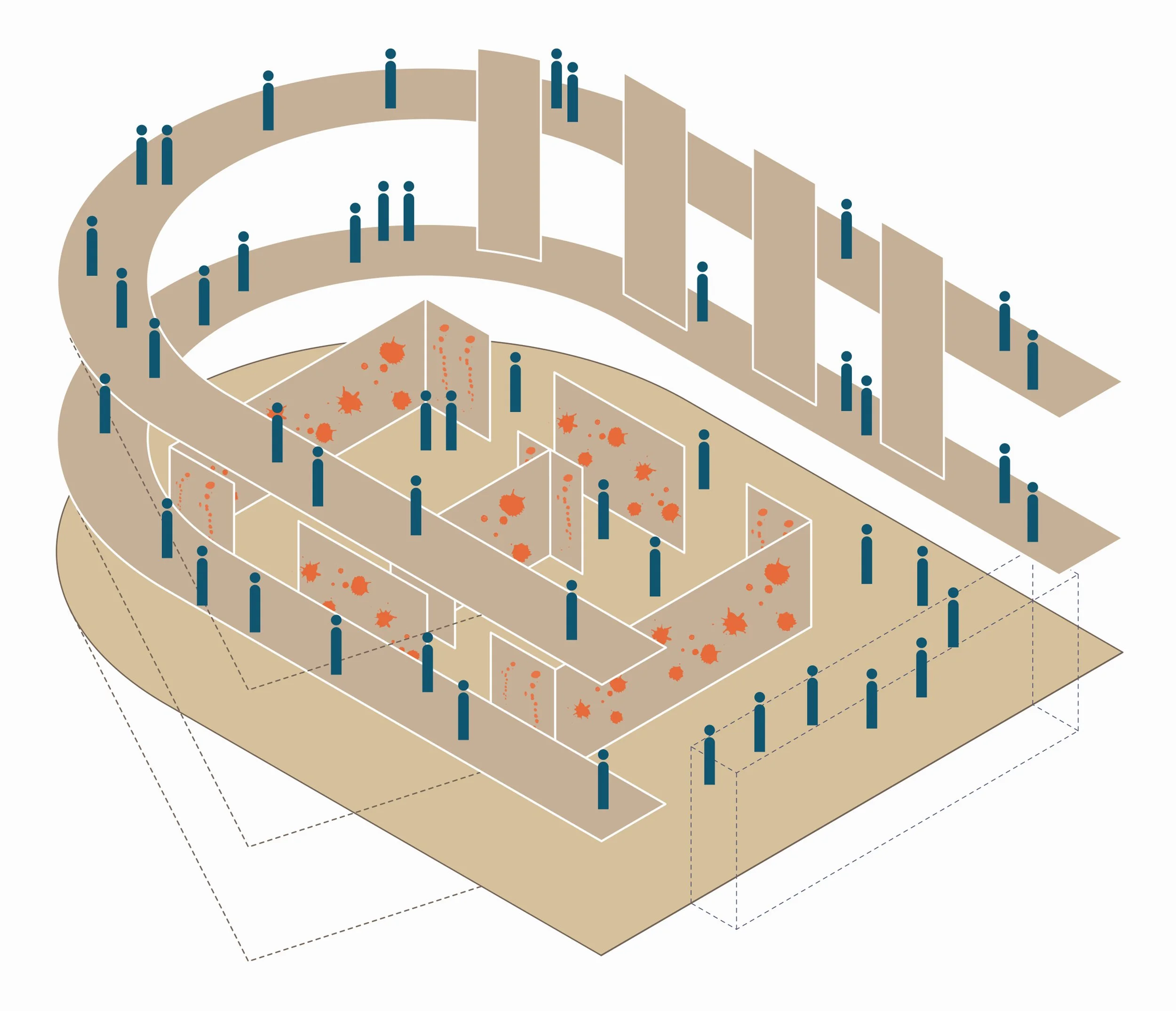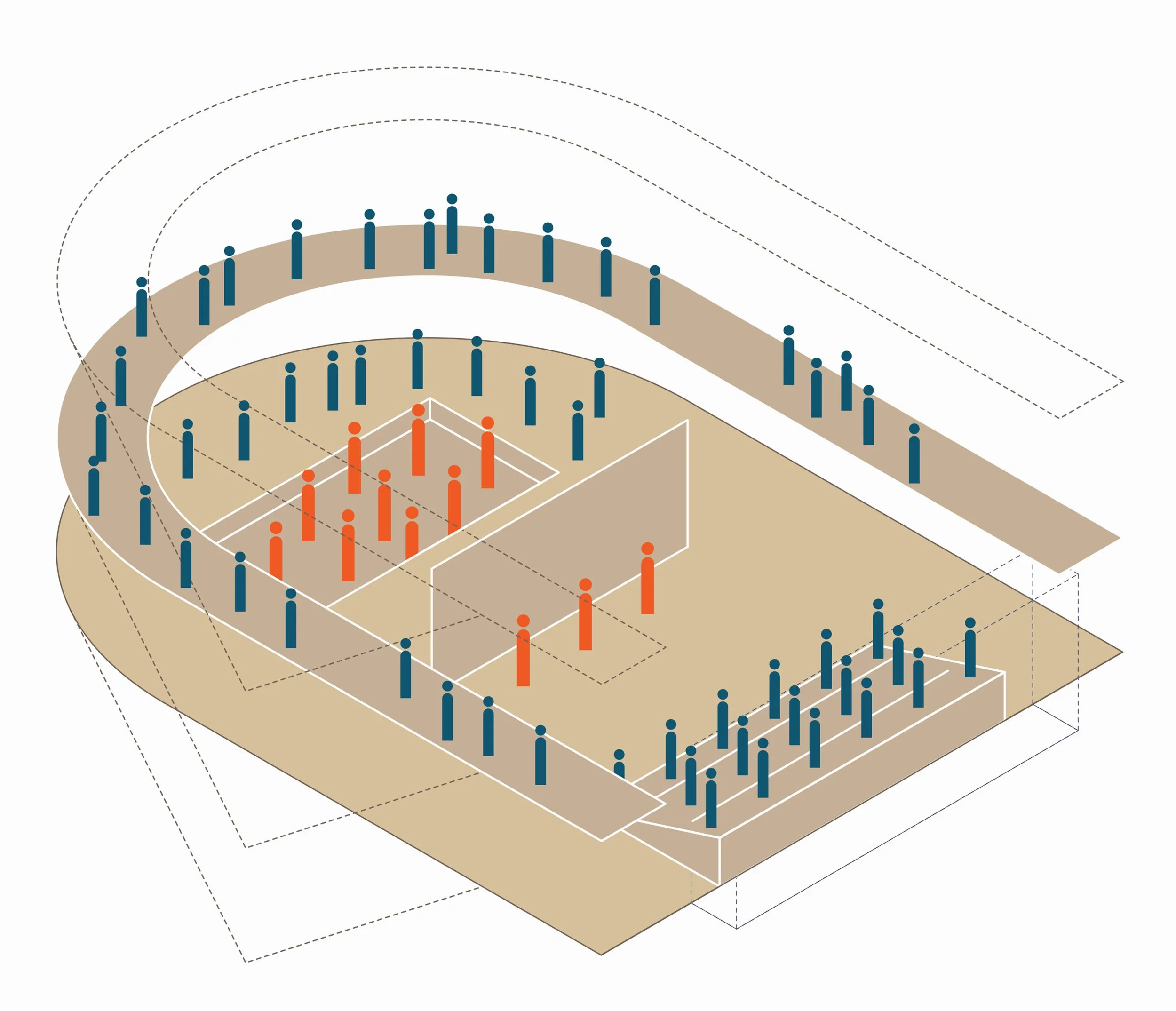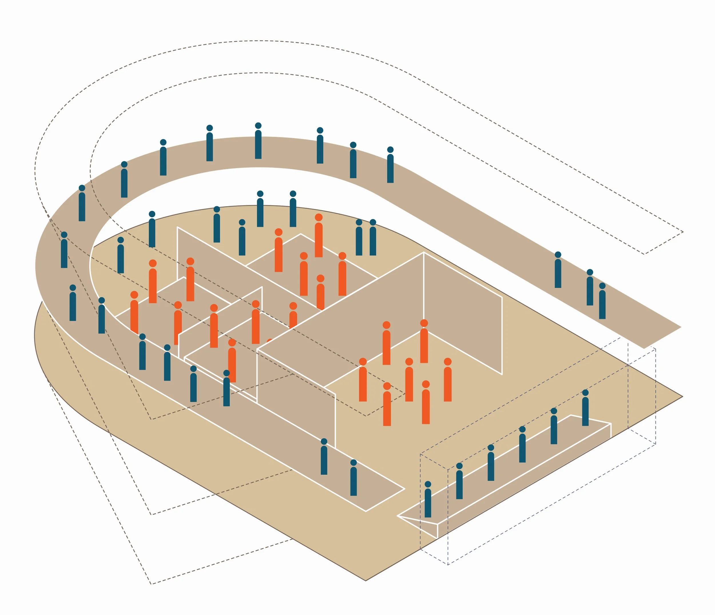 I ballatoi sospesi all’esoscheletro, che possono assumere dal punto di vista funzionale ruoli molto diversi (supporto operativo per gli allestimenti, connessioni distributive, percorsi espositivi, palchi affacciati sulla scena, etc.), consentono di abitare il guscio murario a diverse altezze, e contemporaneamente ne mutano la percezione attraverso l’ordine orizzontale dei ponti sovrapposti. Rendendola esplicita, questi elementi fanno della complessa articolazione di flussi e usi un concreto fattore compositivo.