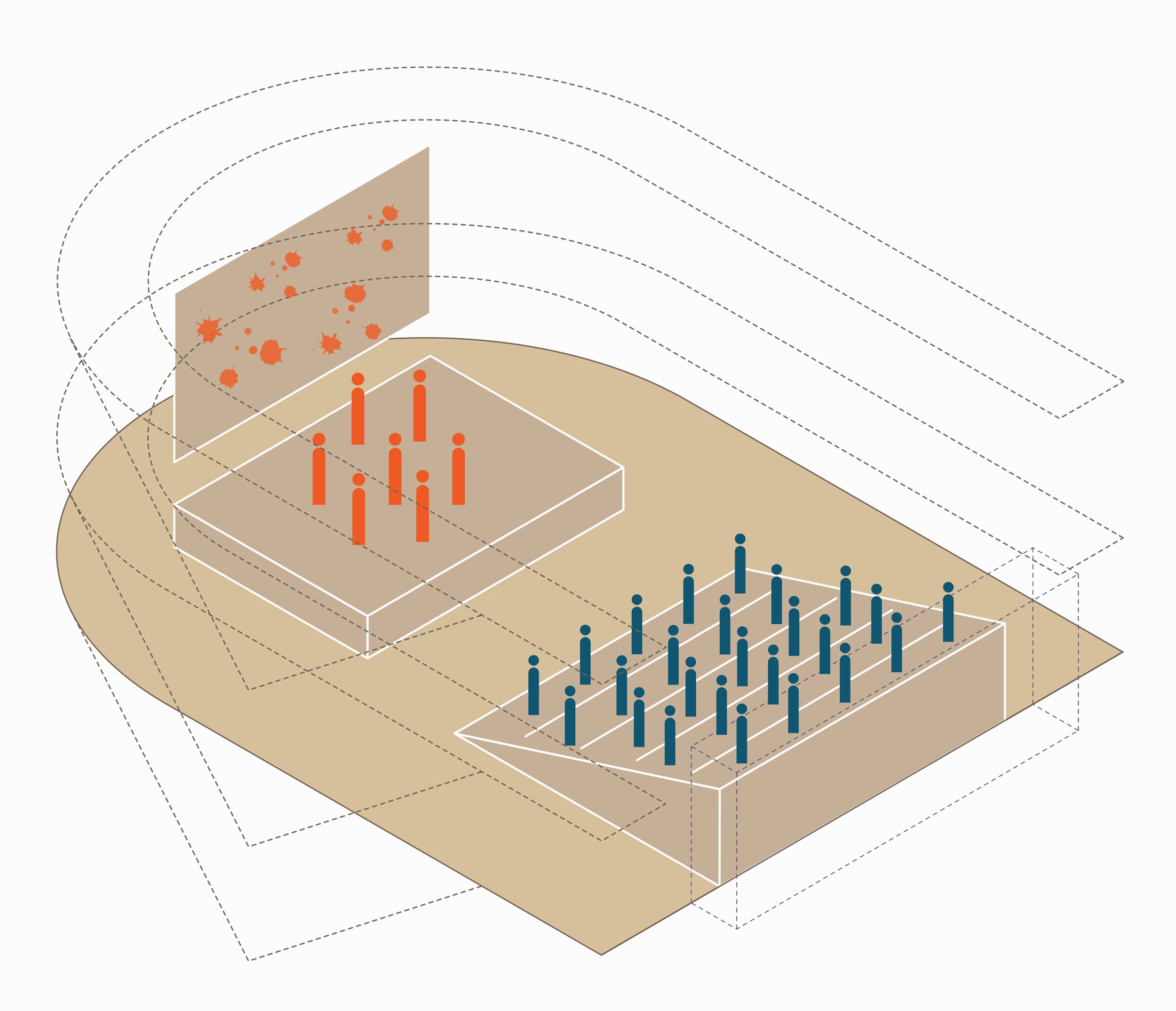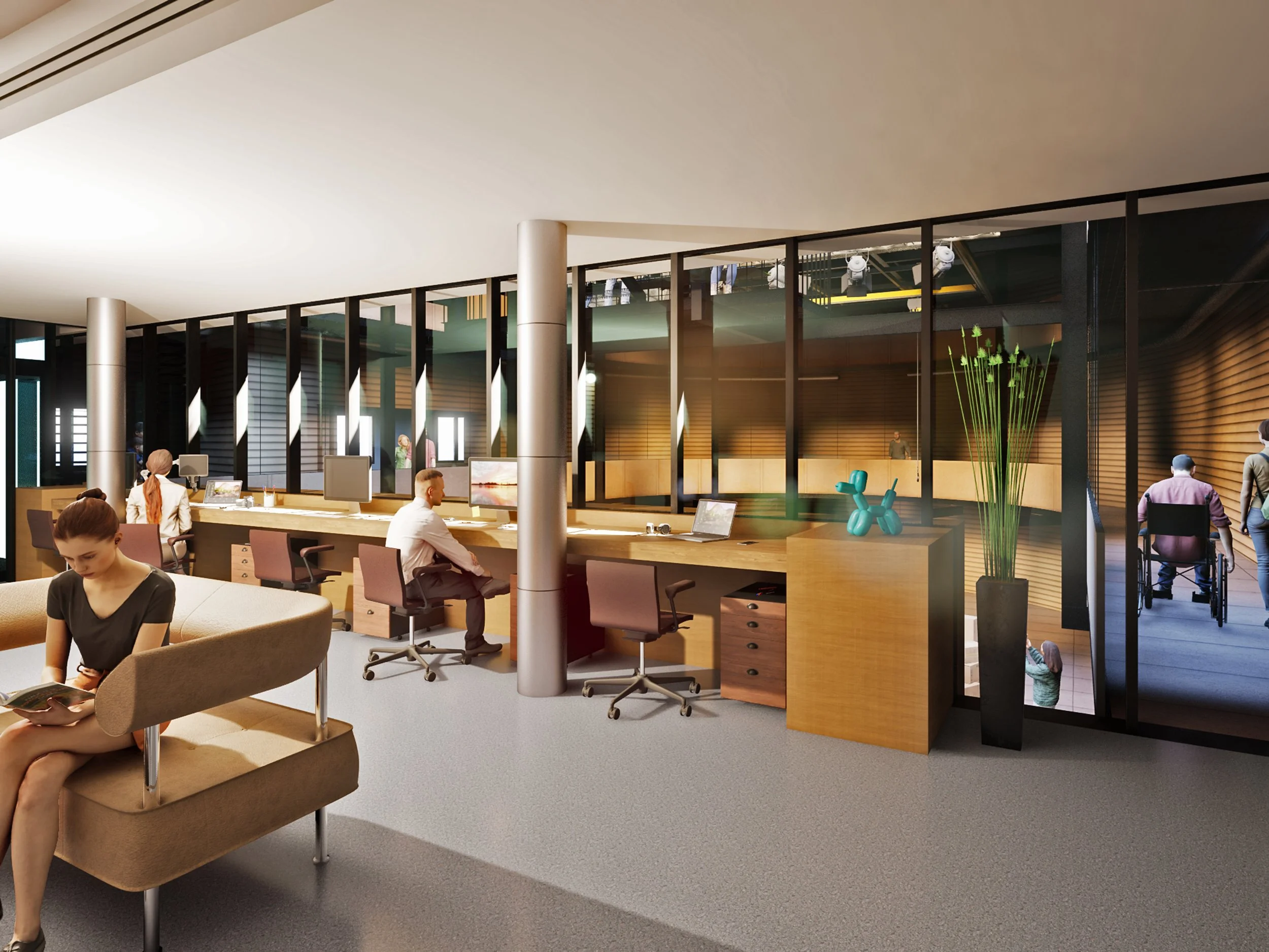 Il nostro progetto di riqualificazione non si configura quindi come una semplice rifunzionalizzazione, ma come un gesto di apertura: un dispositivo architettonico pensato per adattarsi nel tempo, accogliere nuove pratiche artistiche e offrire alla città un luogo di relazione, sperimentazione e crescita condivisa. L’impostazione distributivo-spaziale genera infatti un sistema aperto, predisposto a molteplici sviluppi delle destinazioni funzionali. Gli spazi dedicati alla Produzione Culturale (co-working creativo, caffetteria, laboratorio di arte digitale, workshop e uffici), distribuiti nei vari livelli della parte anteriore, mantengono una relazione diretta – visiva e di prossimità – con il grande Laboratorio di Sperimentazione Contemporanea, senza perdere autonomia distributiva, consentendo molteplici interazioni dei loro usi e delle relazioni e dei flussi che li connettono reciprocamente.