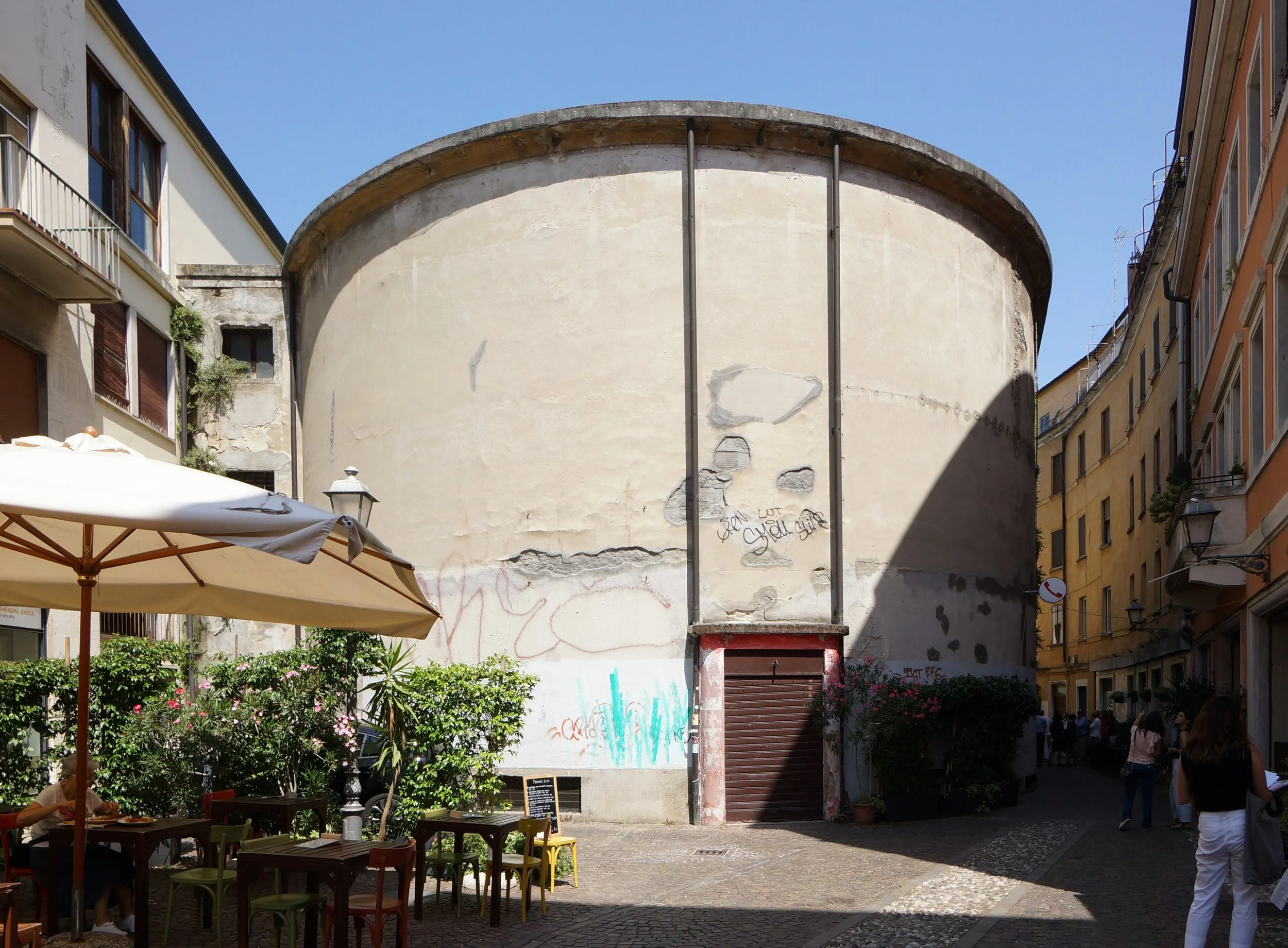 Il rapporto con la città è un ulteriore elemento strategico: l’Incubatore si inserisce nella rete culturale circostante – Biblioteca Civica Bertoliana, Palladio Museum, Liceo Pigafetta, Palazzo Thiene, etc. – e diventa un snodo capace di recuperare nuove permeabilità tra interno ed esterno, facendo in modo che queste permeabilità generino l’occasione di un coinvolgimento dello spazio urbano. Lo slargo sulla stradella del Garofolino è da questo punto di vista, e in rapporto con l’uscita dalla pseudo-abside, particolarmente interessante, poiché apre nuove possibilità di espressione e di fruizione, potendo immaginare occasioni nelle quali quello spazio urbano, raccolto come fosse esso stesso una sala a cielo aperto, diventa parte integrante del Laboratorio di Sperimentazione Contemporanea.