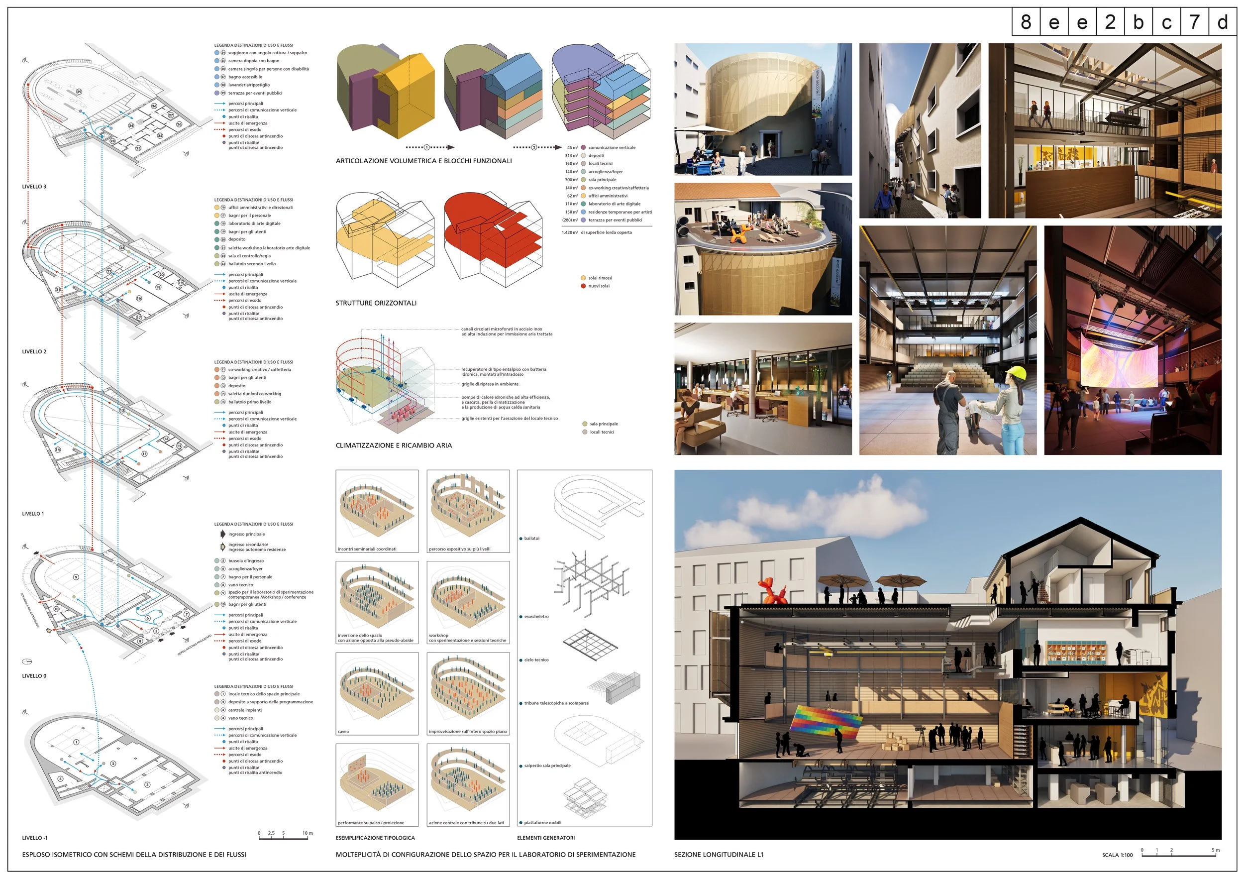 La mixité funzionale, la grande sala come un’officina e il rapporto con la città, sono gli obiettivi strategici del progetto. Essi convergono nella costruzione di uno spazio che interpreta il cambiamento come risorsa e struttura la propria identità attraverso l’interazione.