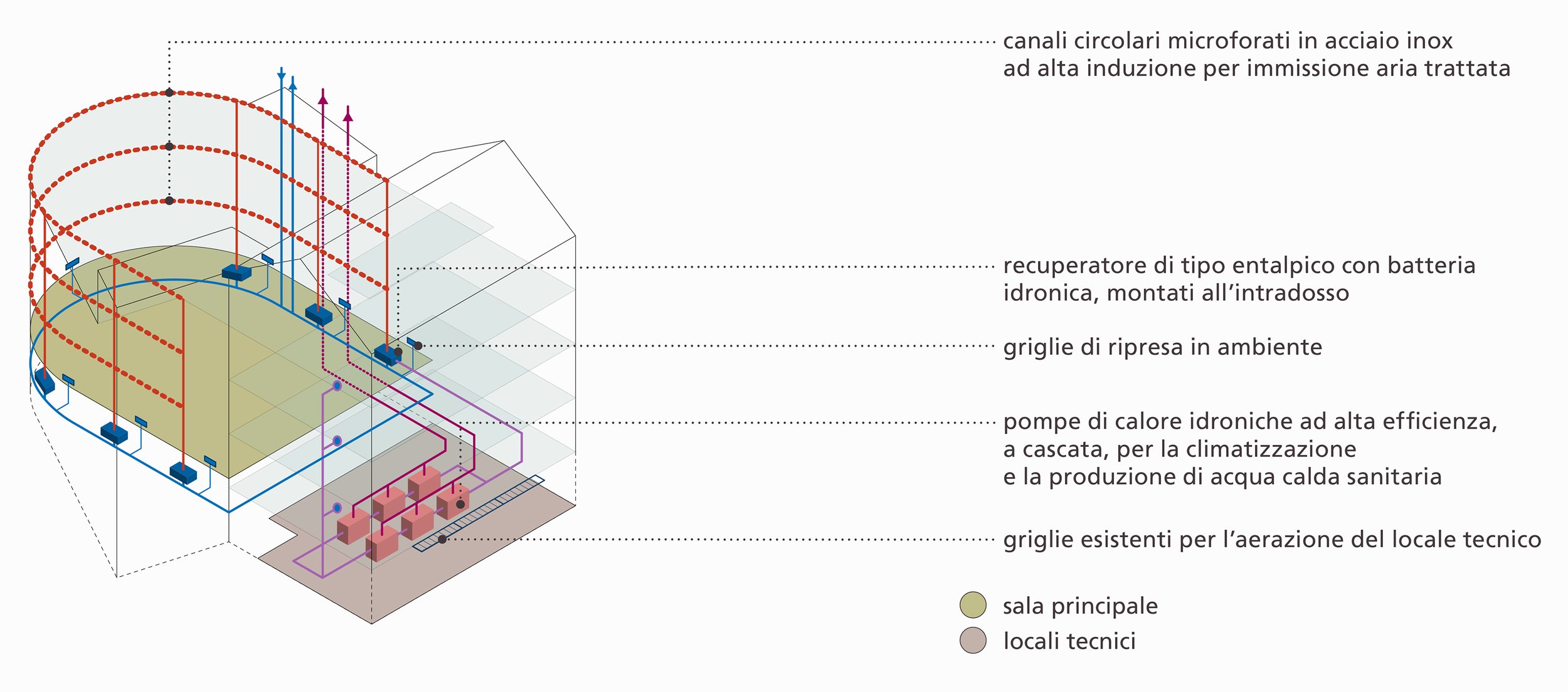 Su questi si innestano formalmente i nuovi principali elementi aerei dello spazio della sala: l’esoscheletro, con le ordinate verticali e il cielo tecnico, e i ballatoi. Sono elementi fondamentali per la composizione di quello spazio, oltre che esserlo anche strutturalmente e funzionalmente. Le ordinate, costituite da profili in ferro a vista, scandiscono la concavità dello spazio, mentre il cielo tecnico collega gli elementi portanti e ospita la cabina regia e una passerella aerea verso la parete di interfaccia con gli spazi per la Produzione Culturale.