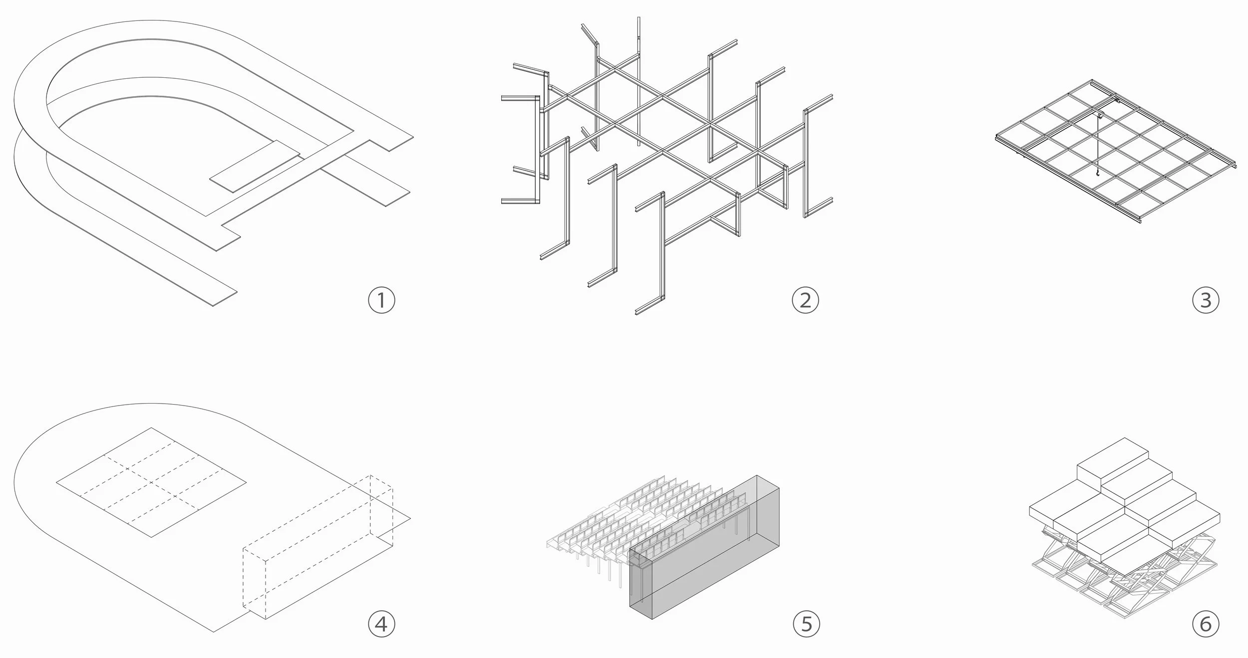 1) ballatoi; 2) esoscheletro; 3) cielo tecnico; 4) calpestio della sala principale; 5) tribune telescopiche a scomparsa; 6) piattaforme mobili.